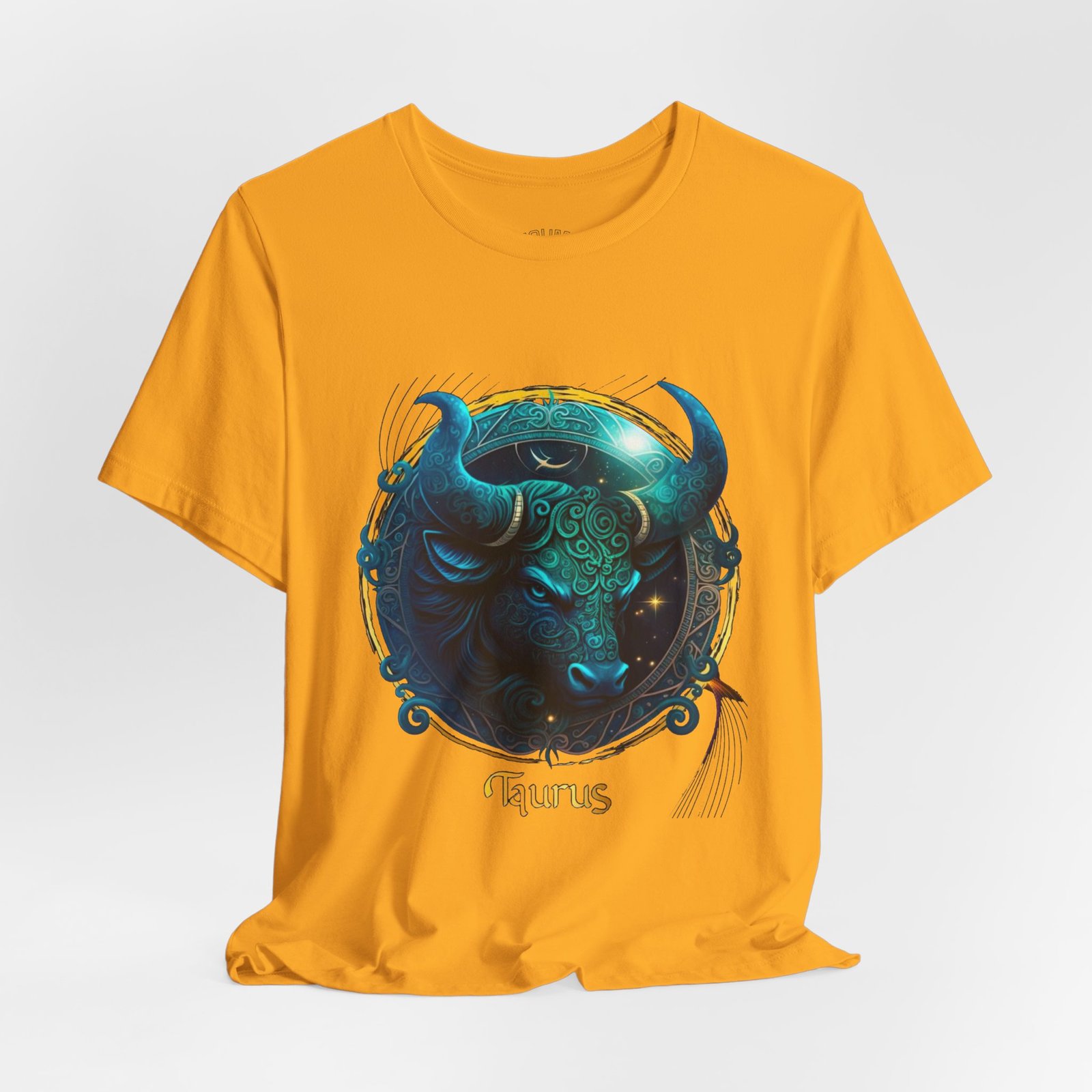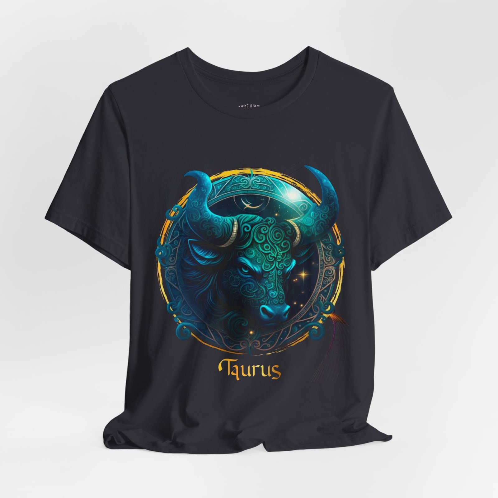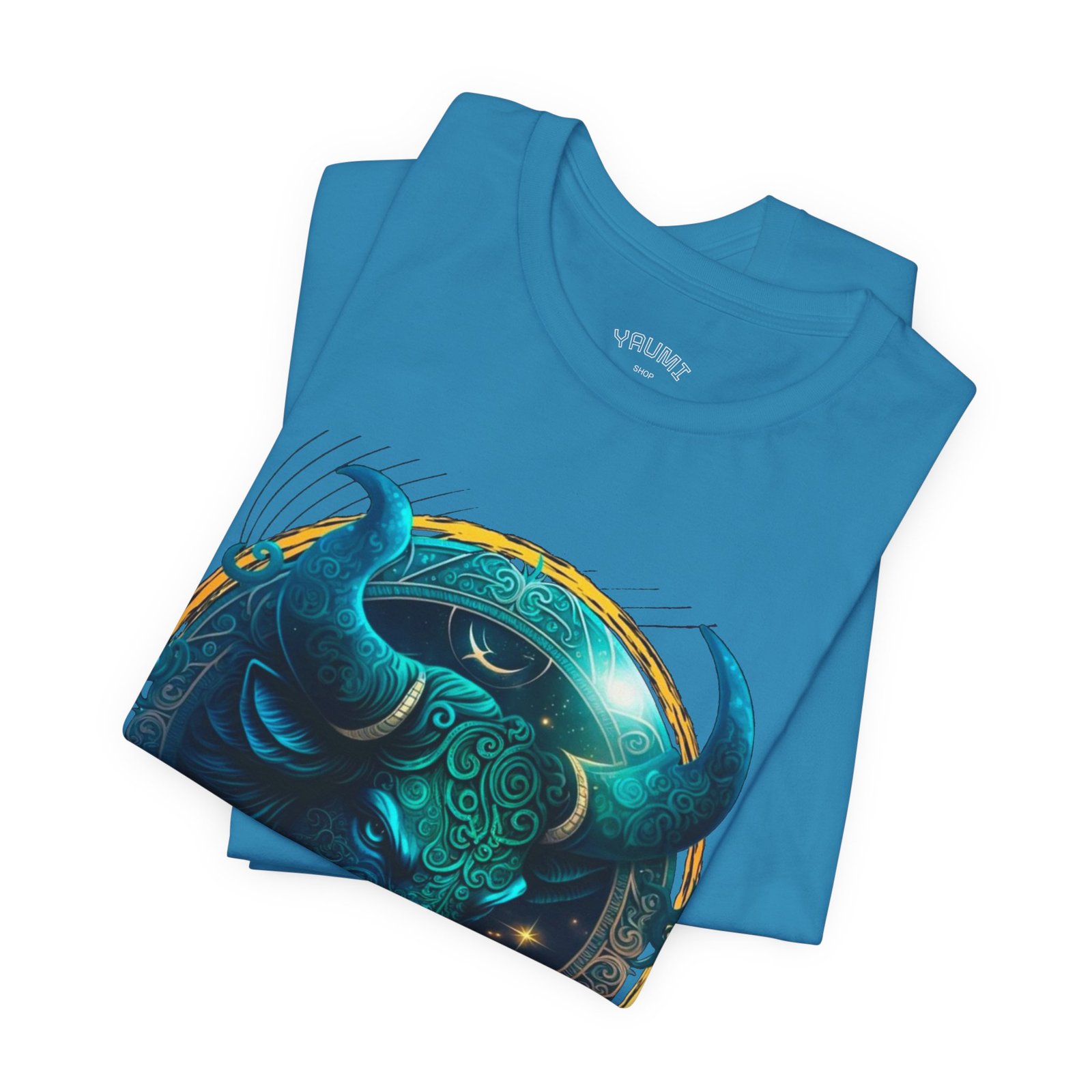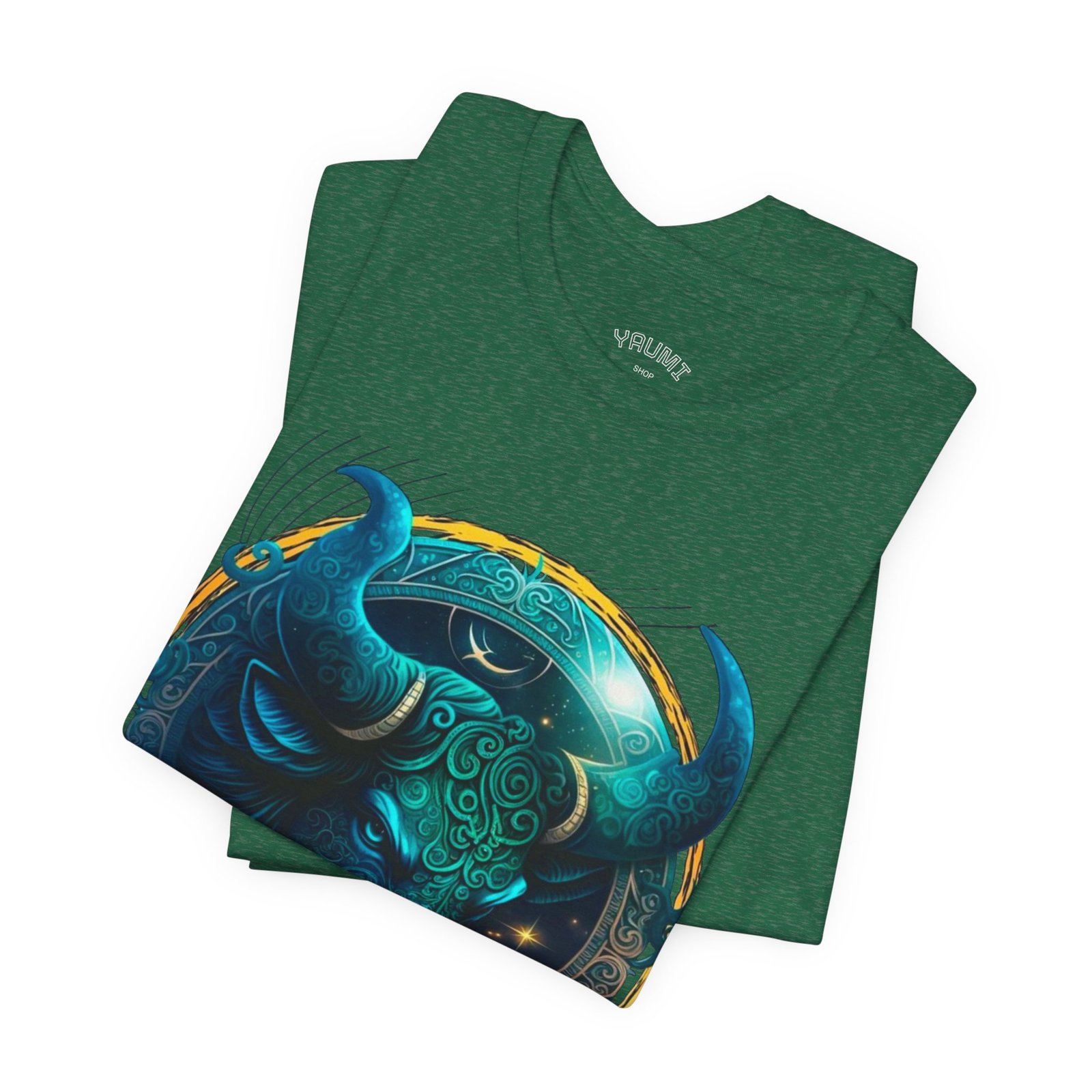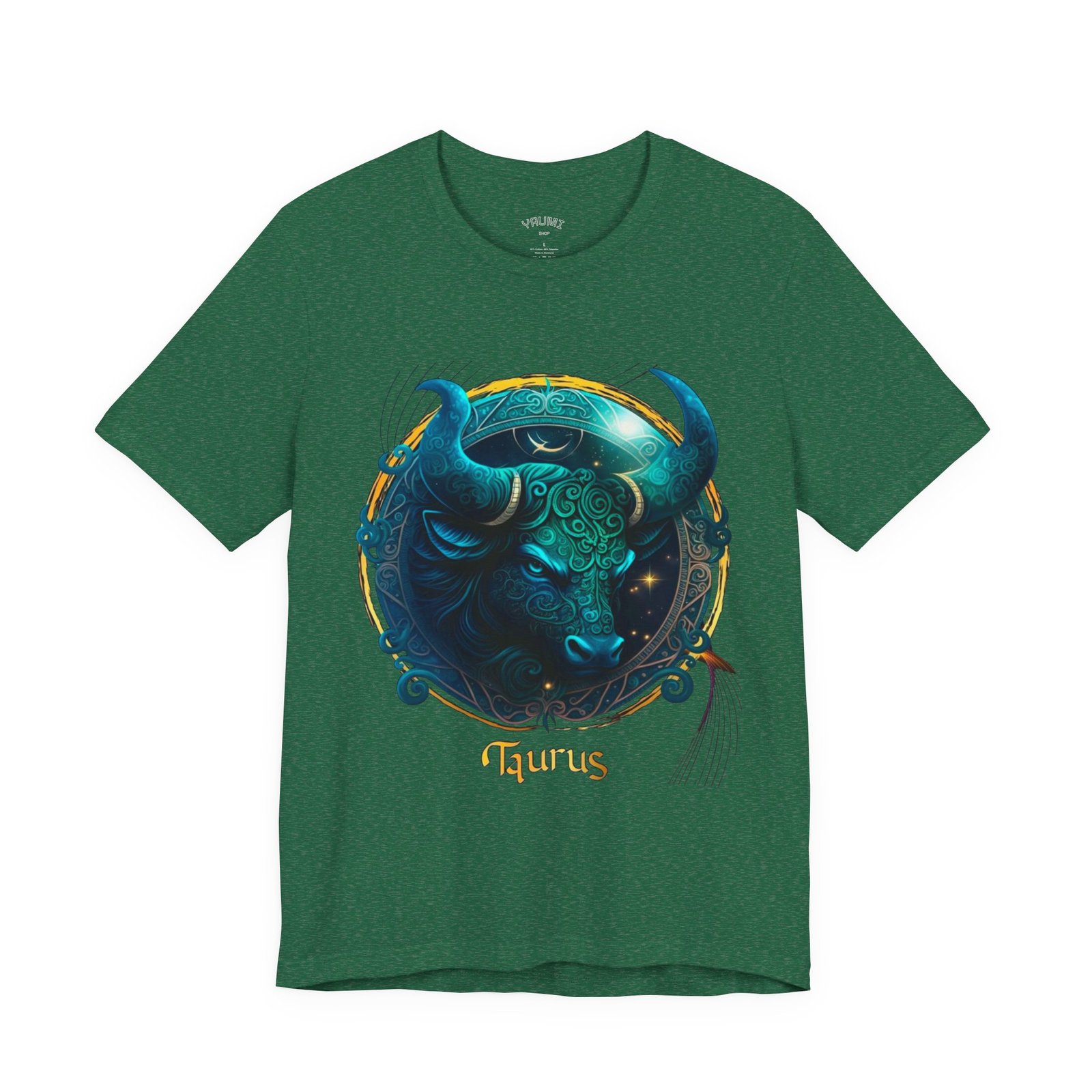 This tee brings the grounded strength of Taurus to your everyday wardrobe. The artwork centers on a richly detailed bull rendered in deep teal and gold accents, framed by an ornate circular motif that feels both celestial and handcrafted. Lightweight Airlume combed cotton keeps the shirt breathable and soft against the skin, while the retail crew neckline and side seams hold a neat, structured silhouette that layers easily under jackets or stands out on its own. Subtle, high-detail printing preserves the illustration’s swirling textures and metallic highlights, so the zodiac symbol reads like a small talisman rather than a loud logo. Wear it on slow mornings, weekend market walks, or when you want a quiet reminder to stay steady and rooted.