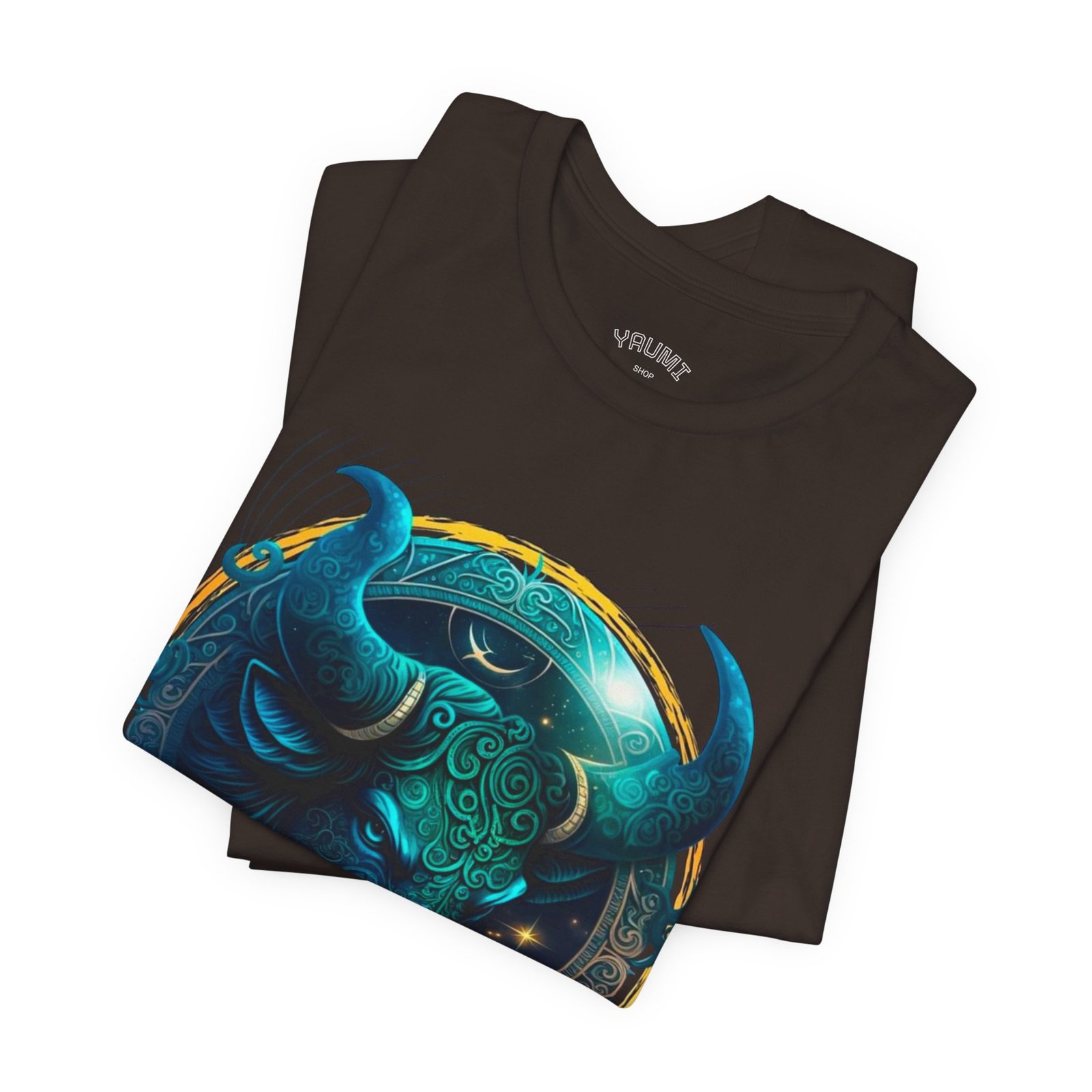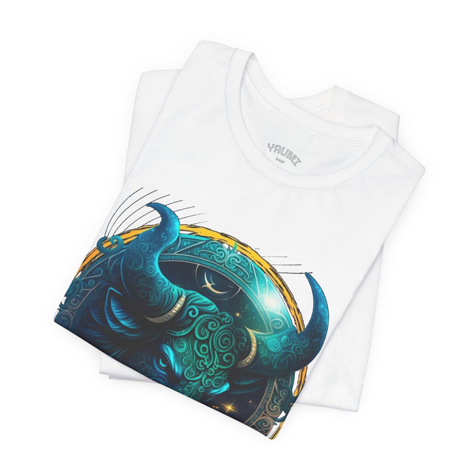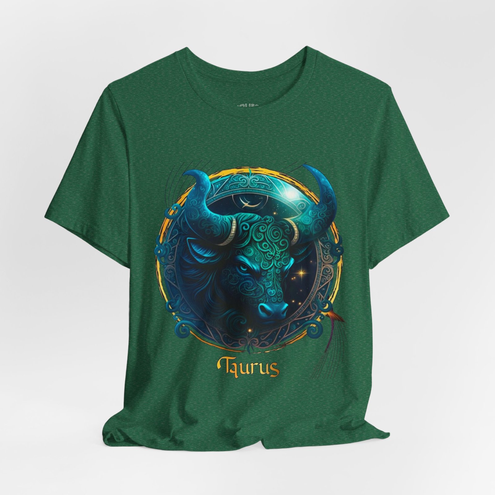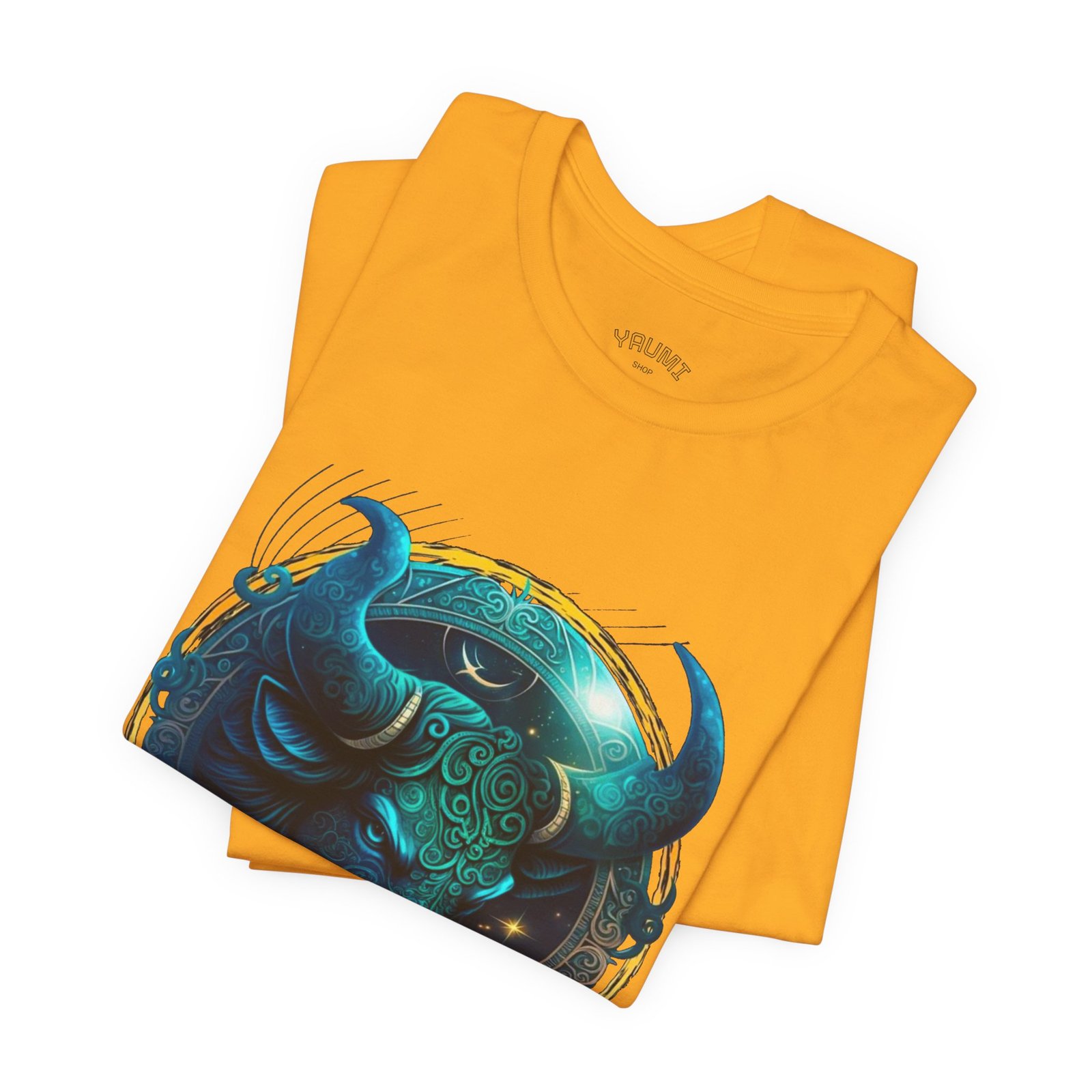 This tee brings the grounded strength of Taurus to your everyday wardrobe. The artwork centers on a richly detailed bull rendered in deep teal and gold accents, framed by an ornate circular motif that feels both celestial and handcrafted. Lightweight Airlume combed cotton keeps the shirt breathable and soft against the skin, while the retail crew neckline and side seams hold a neat, structured silhouette that layers easily under jackets or stands out on its own. Subtle, high-detail printing preserves the illustration’s swirling textures and metallic highlights, so the zodiac symbol reads like a small talisman rather than a loud logo. Wear it on slow mornings, weekend market walks, or when you want a quiet reminder to stay steady and rooted.